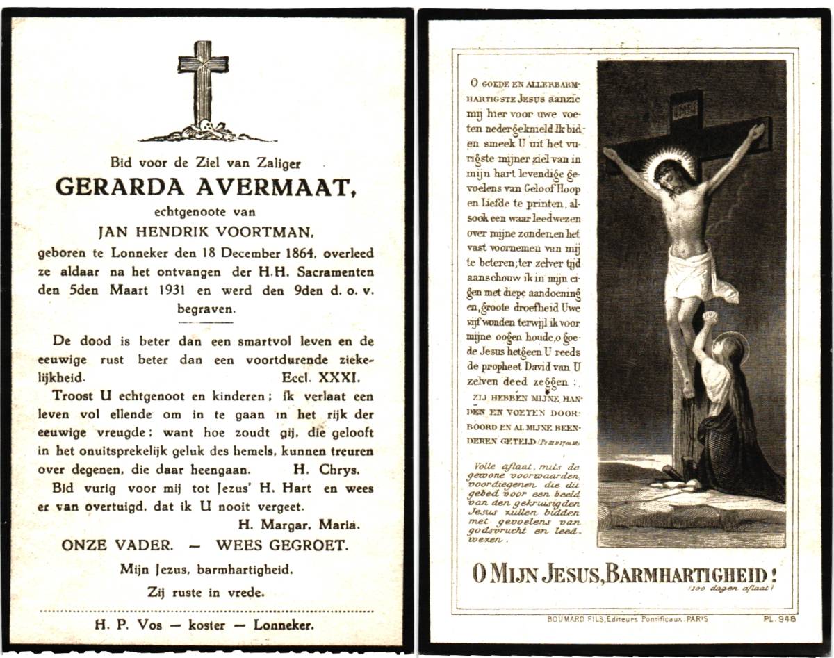 AVERMAAT, Gerarda, geboren op 18-12-1864 te Lonneker, overleden op 5-3-1931 te Lonneker op 76-jarige leeftijd, begraven op 9-3-1931 te Lonneker.