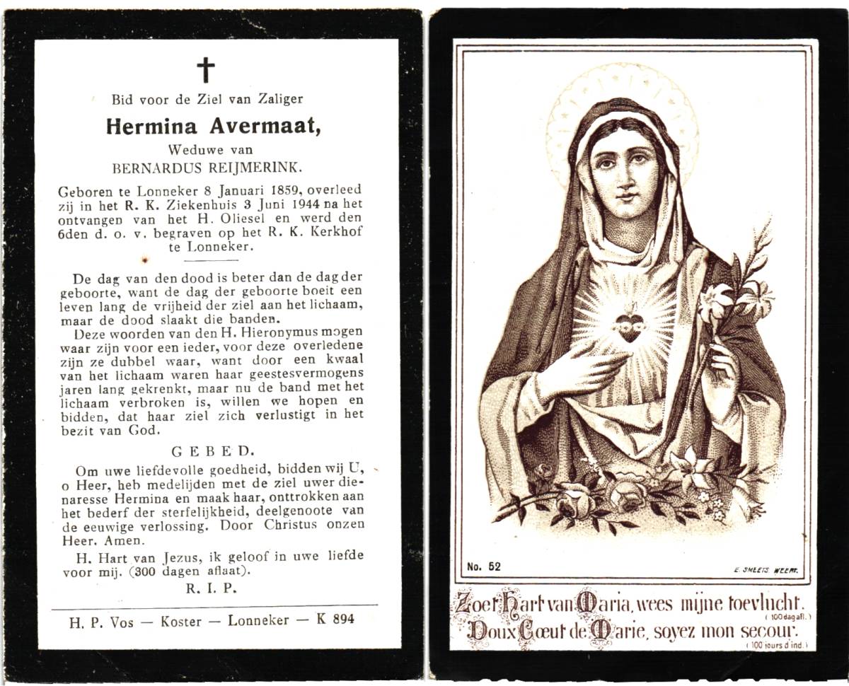 AVERMAAT, Hermina, geboren op 08-01-1859 te Lonneker, overleden op 3-6-1944 te Enschede, ziekenhuis op 85-jarige leeftijd, begraven op 6-6-1944 te Lonneker.
