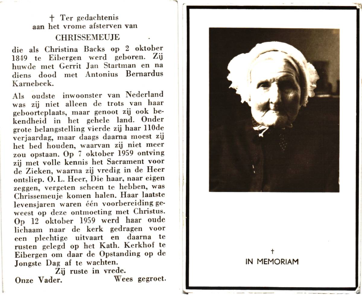 ALFRINK, Hendrika Wilhelmina, geboren op 04-12-1866 te Eibergen, overleden op 13-1-1955 te Eibergen op 88-jarige leeftijd, begraven op 17-1-1955 te Eibergen.