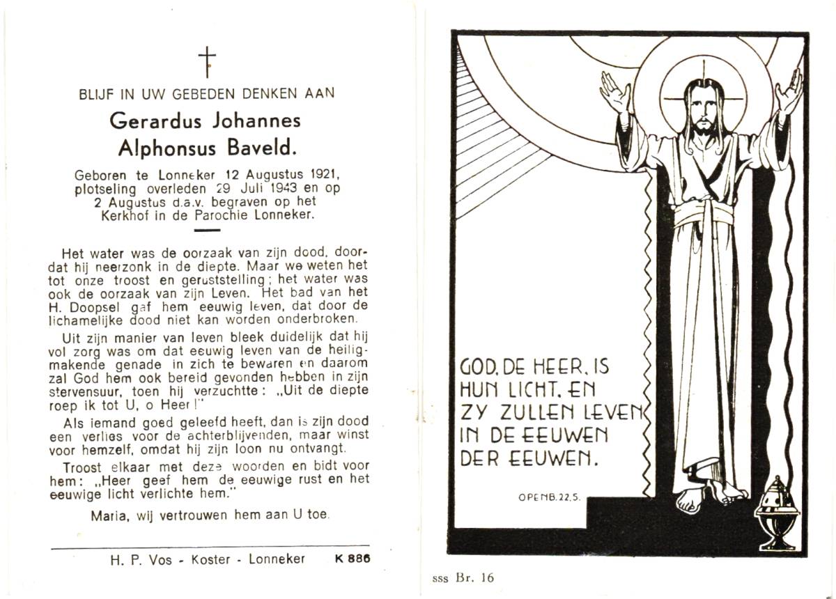 BAVELD, Gerardus Johannes Alphonsus, geboren op 12-8-1921 te Lonneker, overleden op 29-7-1943 te Lonneker op 21-jarige leeftijd, begraven op 2-8-1943 te Lonneker.