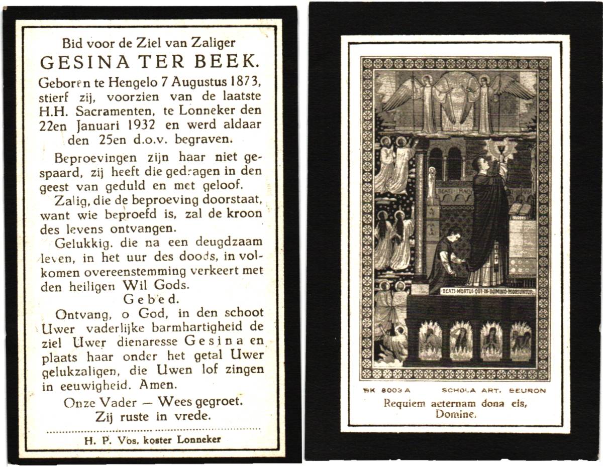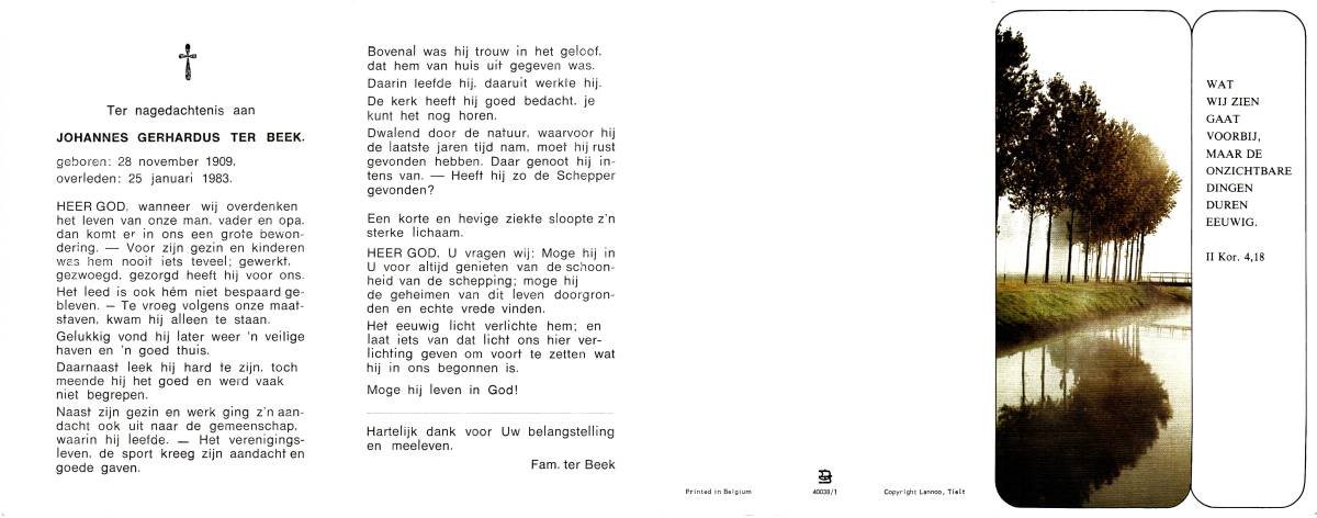 BEEK, ter, Gerhardus Johannes, geboren op 26-07-1878 te Losser, overleden op 26-3-1962 te Losser op 83-jarige leeftijd, begraven op 29-3-1962 te Losser.