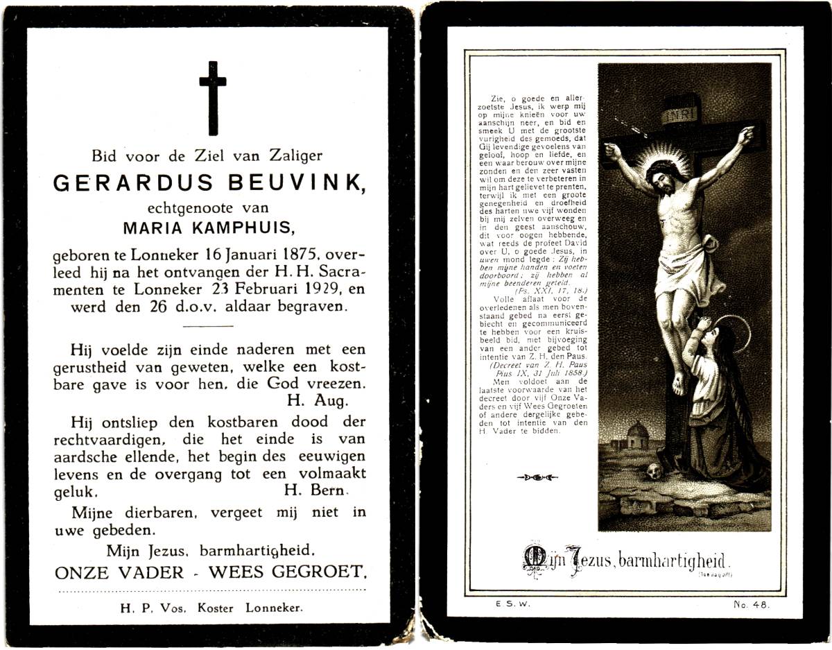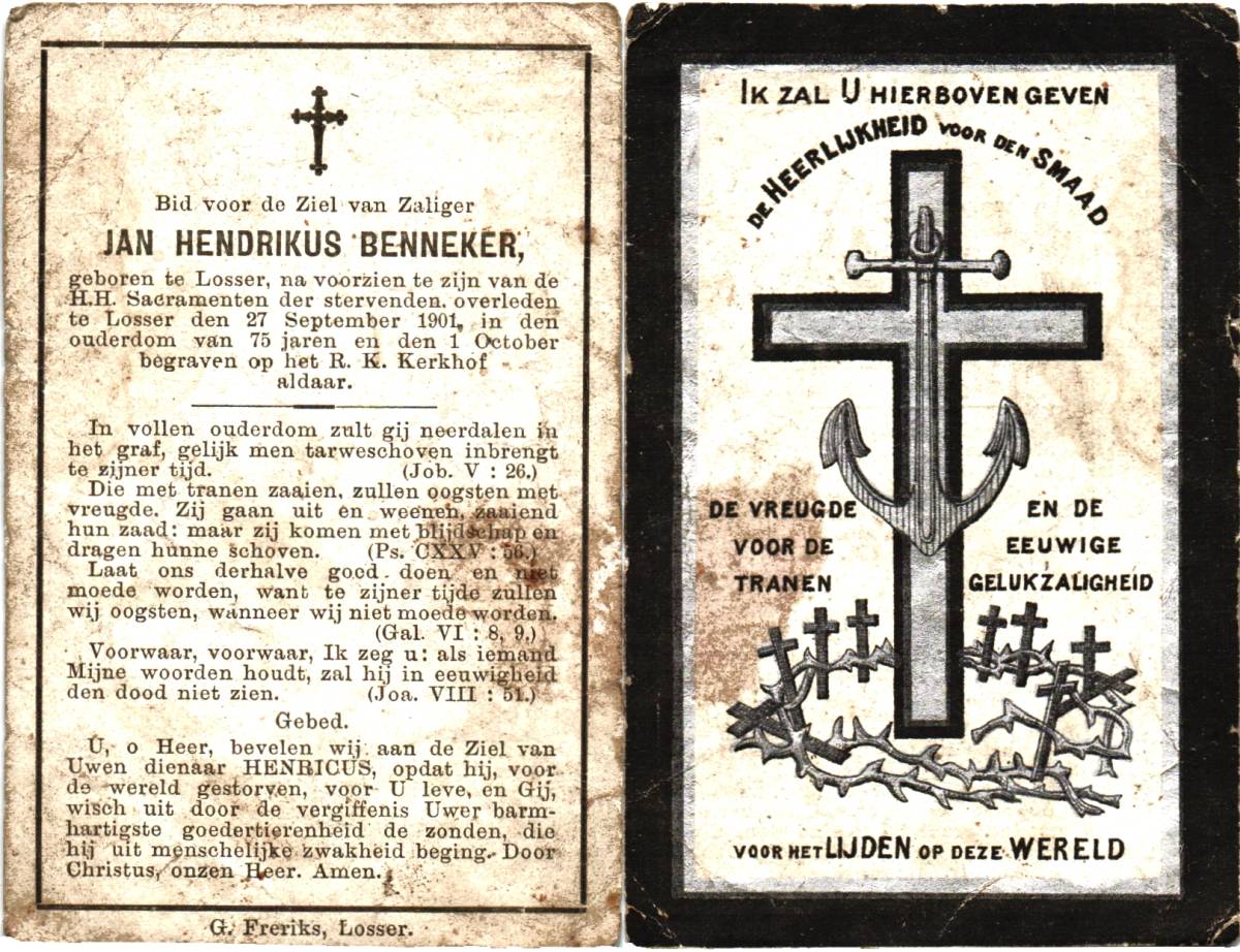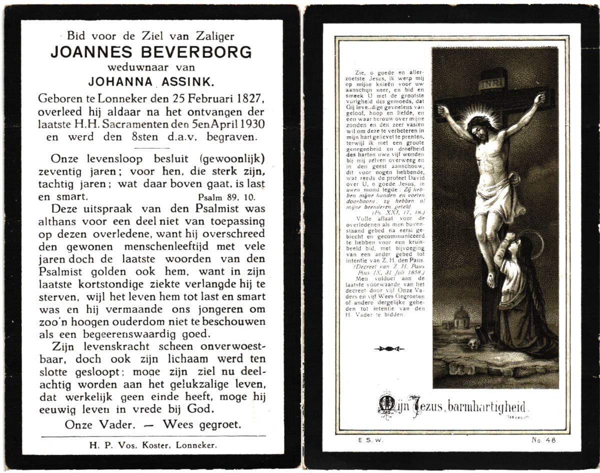 BEVERBORG, Joannes, geboren op 25-02-1827 te Lonneker, overleden op 5-4-1930 te Lonneker op 103-jarige leeftijd, begraven op 8-4-1930 te Lonneker.