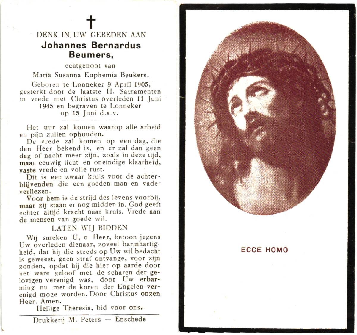 BEUMERS, Johannes Bernardus, geboren op 9-4-1905 te Lonneker, overleden op 11-6-1945 te Lonneker op 40-jarige leeftijd, begraven op 15-6-1945 te Lonneker.