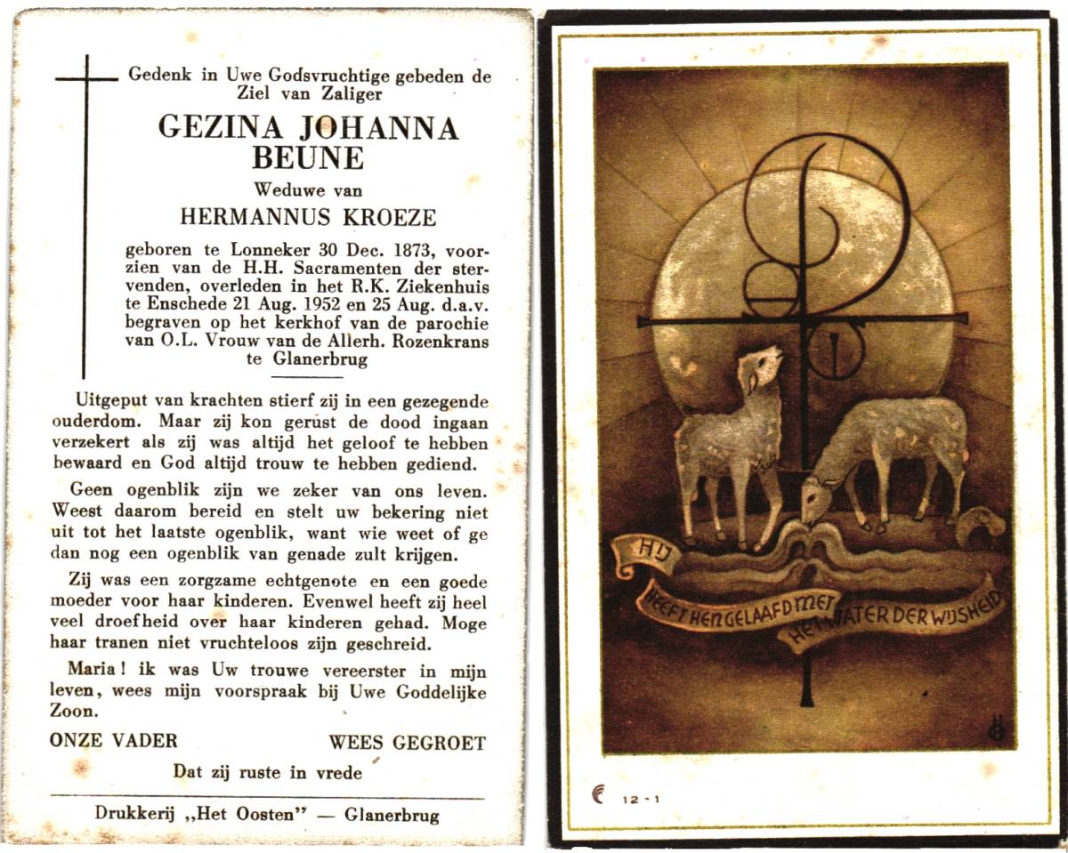 BEUNE, Gezina Johanna, geboren op 30-12-1873 te Lonneker, overleden op 21-8-1952 te Enschede, ziekenhuis op 78-jarige leeftijd, begraven op 25-8-1952 te Glanerbrug.