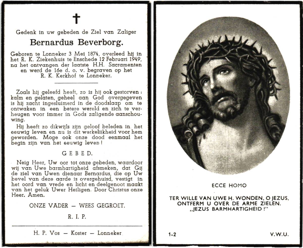 BEVERBORG, Bernardus, geboren op 03-05-1874 te Lonneker, overleden op 12-2-1949 te Enschede, ziekenhuis op 74-jarige leeftijd, begraven op 16-2-1949 te Lonneker.