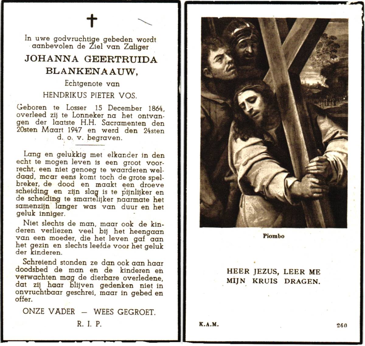 BLANKENBAAUW, Johanna Geertruida, geboren op 15-12-1864 te Losser, overleden op 20-3-1947 te Lonneker op 82-jarige leeftijd, begraven op 24-3-1947 te Lonneker.