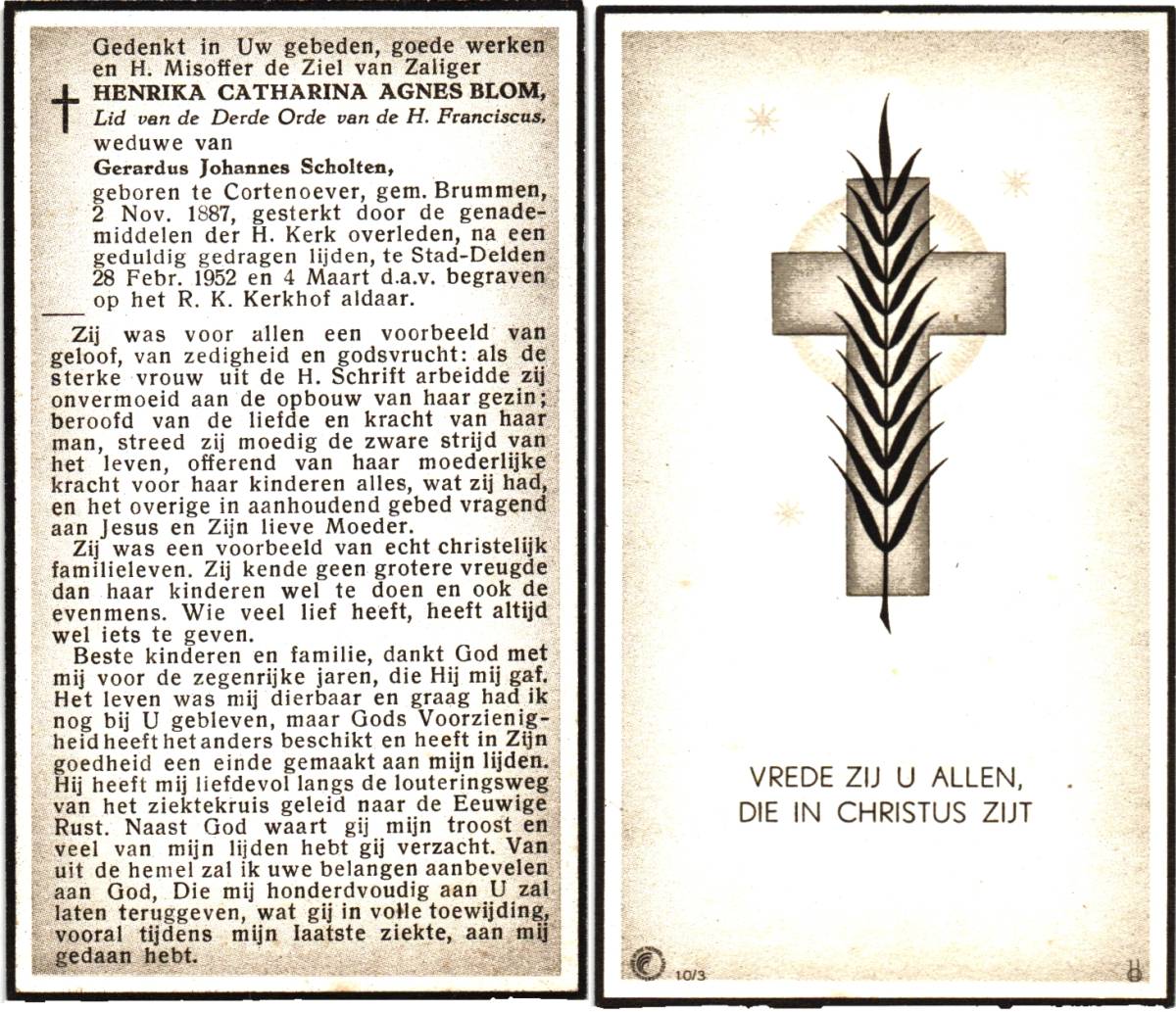 BLOM, Henrika Catharina Agnes, geboren op 02-11-1887 te Cortenoever, Brummen, overleden op 28-2-1952 te Delden, Stad op 64-jarige leeftijd, begraven op 4-3-1952 te Delden, Stad.