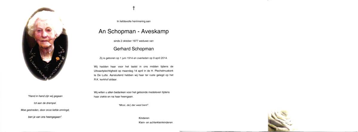 AVESKAMP, An, geboren op 1-6-1914, overleden op 9-4-2014 op 99-jarige leeftijd, begraven op 14-4-2014 te De Lutte.