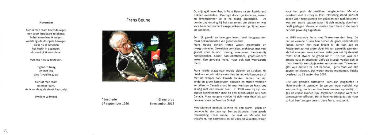 BEUNE, Frans, geboren op 17-9-1926 te Enschede, overleden op 6-11-2015 te Glanerbrug op 89-jarige leeftijd.