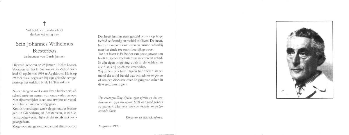 BIESTERBOS, Sein Johannes Wilhelmus, geboren op 28-1-1905 te Losser, overleden op 26-5-1998 te Apeldoorn op 93-jarige leeftijd, begraven op 29-5-1998 te Apeldoorn.