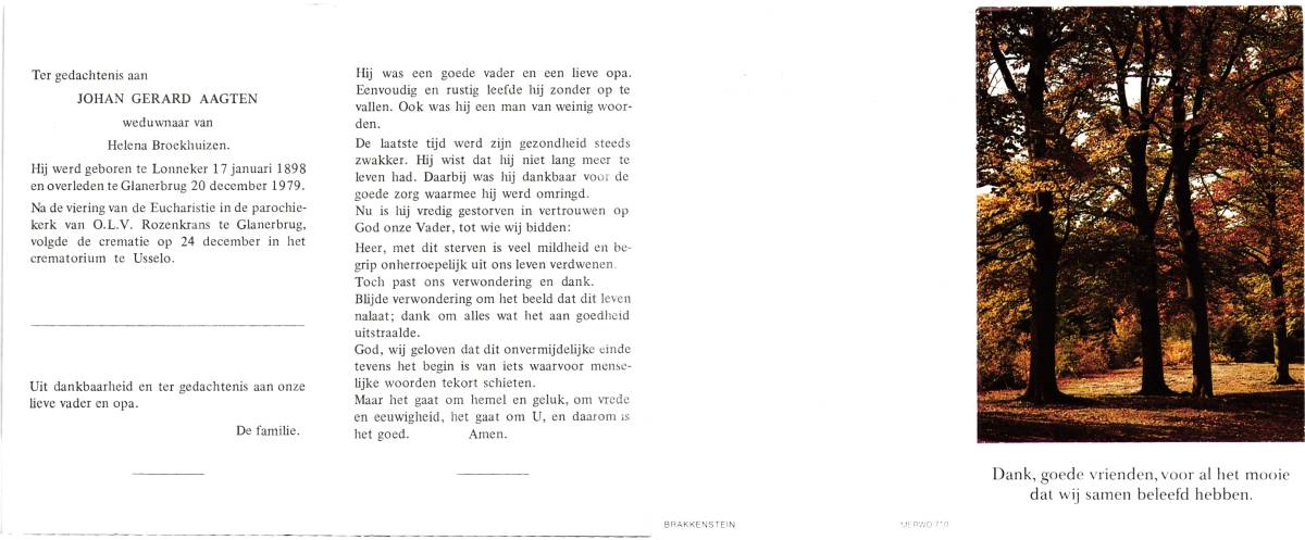AAGTEN, Johan Gerard, geboren op 17-01-1898 te Lonneker, overleden op 20-12-1979 te Glanerbrug op 81-jarige leeftijd, gecremeerd op 24-12-1979 te Usselo (Gem. Enschede).