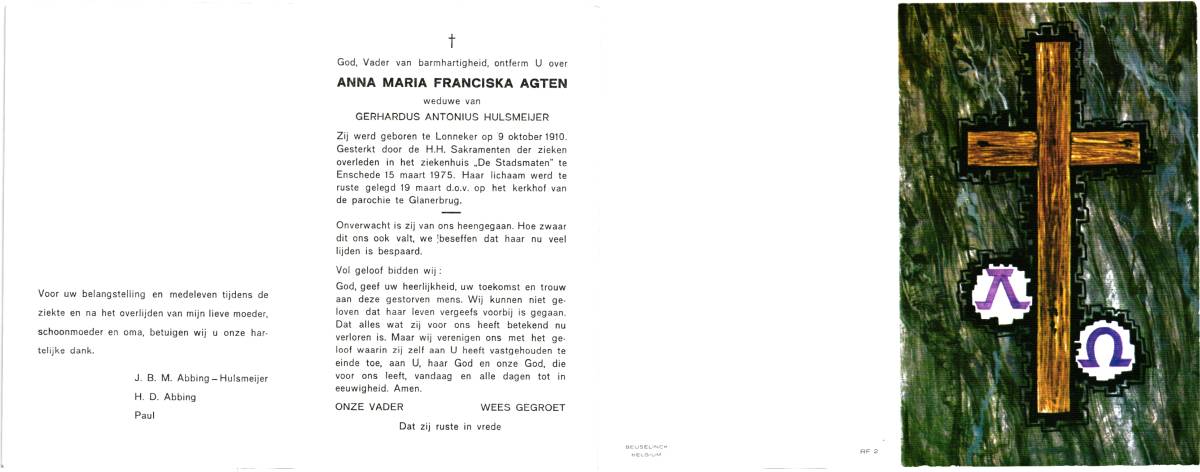 AGTEN, Anna Maria Franciska, geboren op 9-10-1910 te Lonneker, overleden op 15-3-1975 te Enschede op 64-jarige leeftijd, begraven op 19-3-1975 te Glanerbrug.