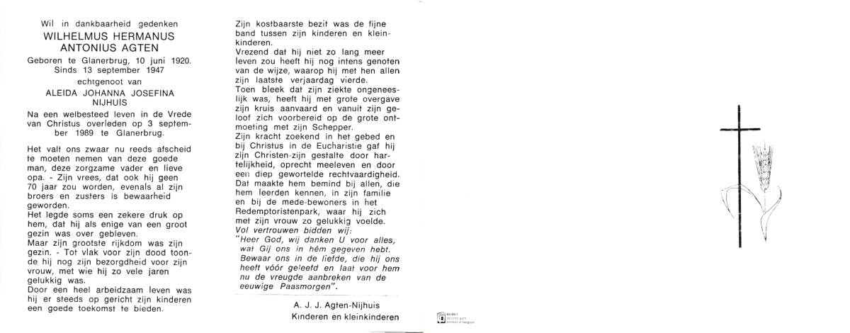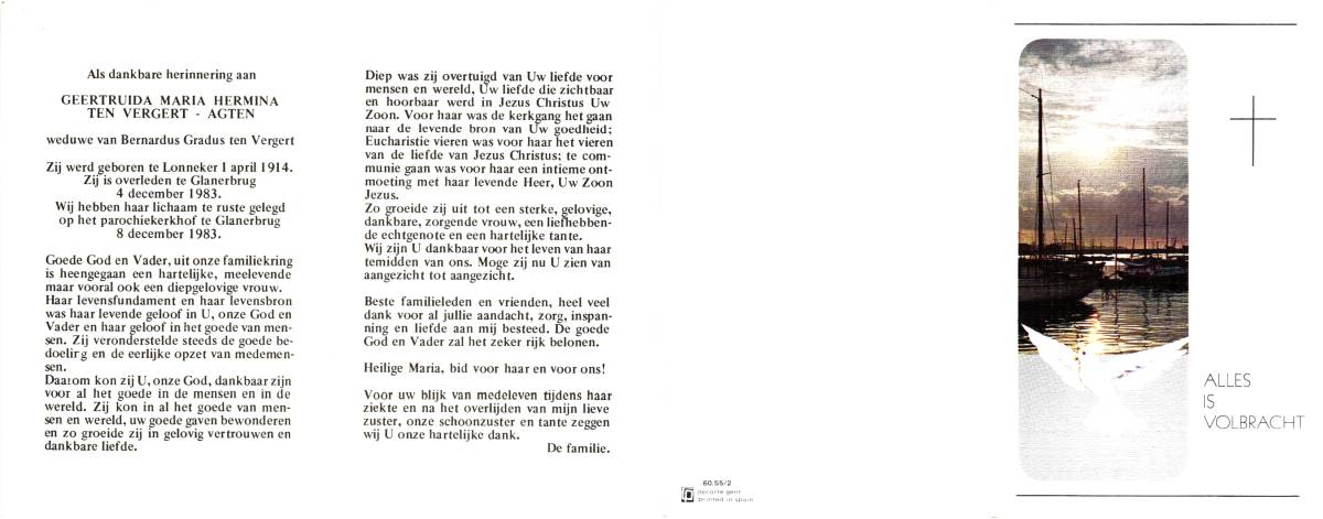 AGTEN, Geertruida Maria Hermina, geboren op 1-4-1914 te Lonneker, overleden op 4-12-1983 te Glanerbrug op 69-jarige leeftijd, begraven op 8-12-1983 te Glanerbrug.
