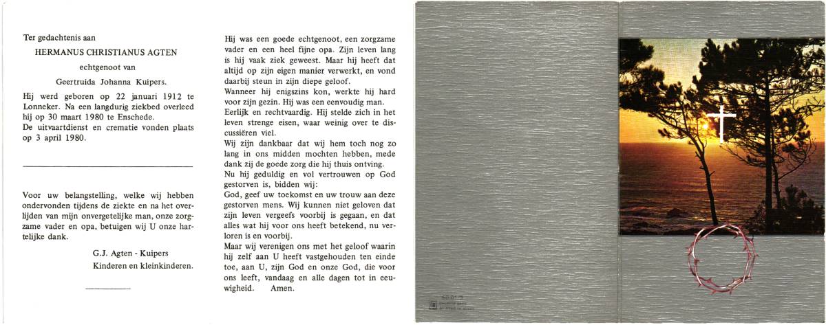 AGTEN, Hermanus Christianus, geboren op 22-1-1912 te Lonneker, overleden op 30-3-1980 te Enschede op 68-jarige leeftijd, gecremeerd op 3-4-1980 te Usselo (Gem. Enschede).