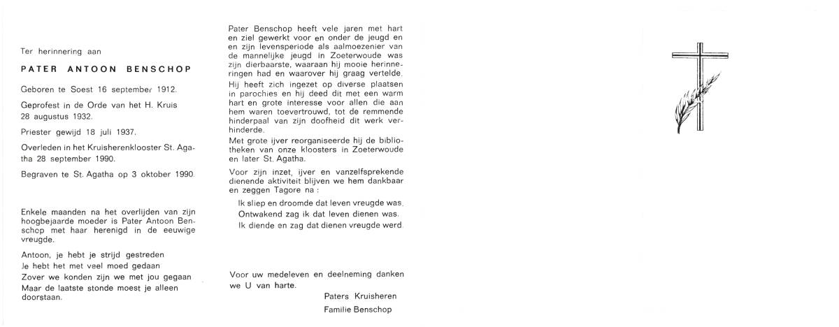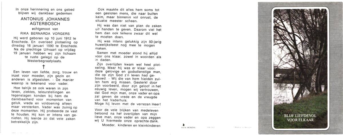 AGTERBOSCH, Antonius Johannes, geboren op 10-6-1912 te Enschede, overleden op 16-1-1990 te Enschede op 77-jarige leeftijd, begraven op 19-1-1990 te Enschede.