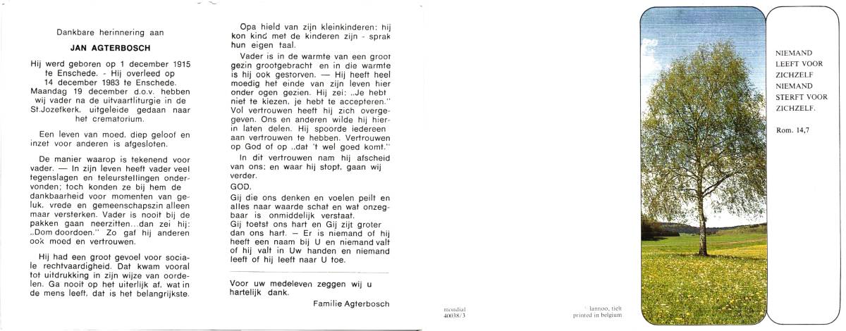 AGTERBOSCH, Jan, geboren op 1-12-1916 te Enschede, overleden op 14-12-1983 te Enschede op 67-jarige leeftijd, gecremeerd op 19-12-1983 te Usselo (Gem. Enschede).