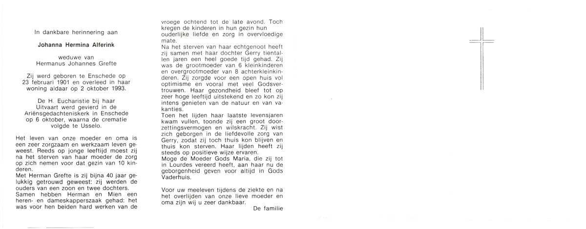ALFERINK, Johanna Hermina, geboren op 23-2-1901 te Enschede, overleden op 2-10-1993 te Enschede op 92-jarige leeftijd, gecremeerd op 6-10-1993 te Usselo (Gem. Enschede).
