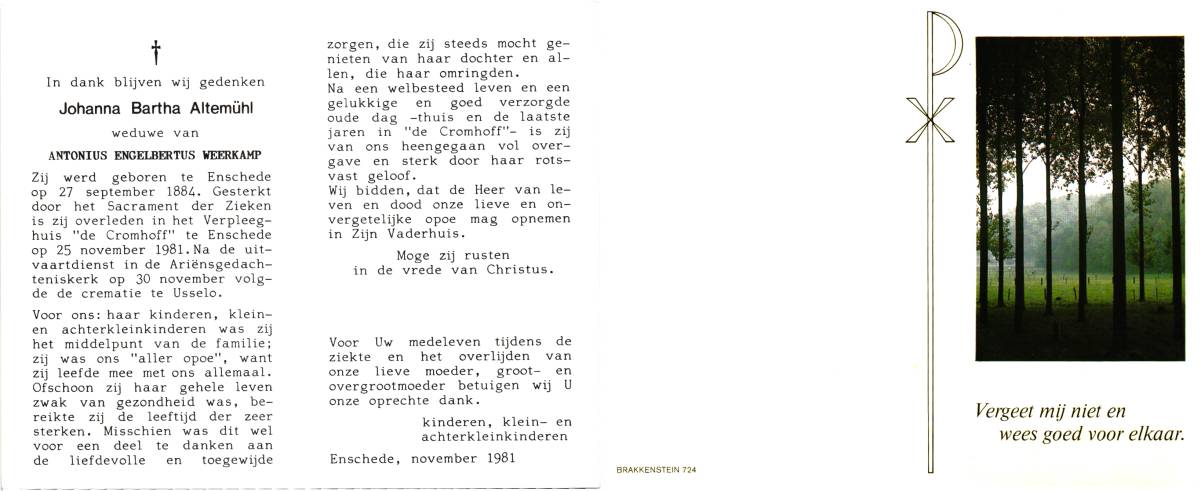 ALTEMÜHL, Johanna Bartha, geboren op 27-09-1884 te Enschede, overleden op 25-11-1981 te Enschede op 97-jarige leeftijd, gecremeerd op 30-11-1981 te Usselo (Gem. Enschede).