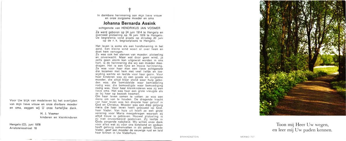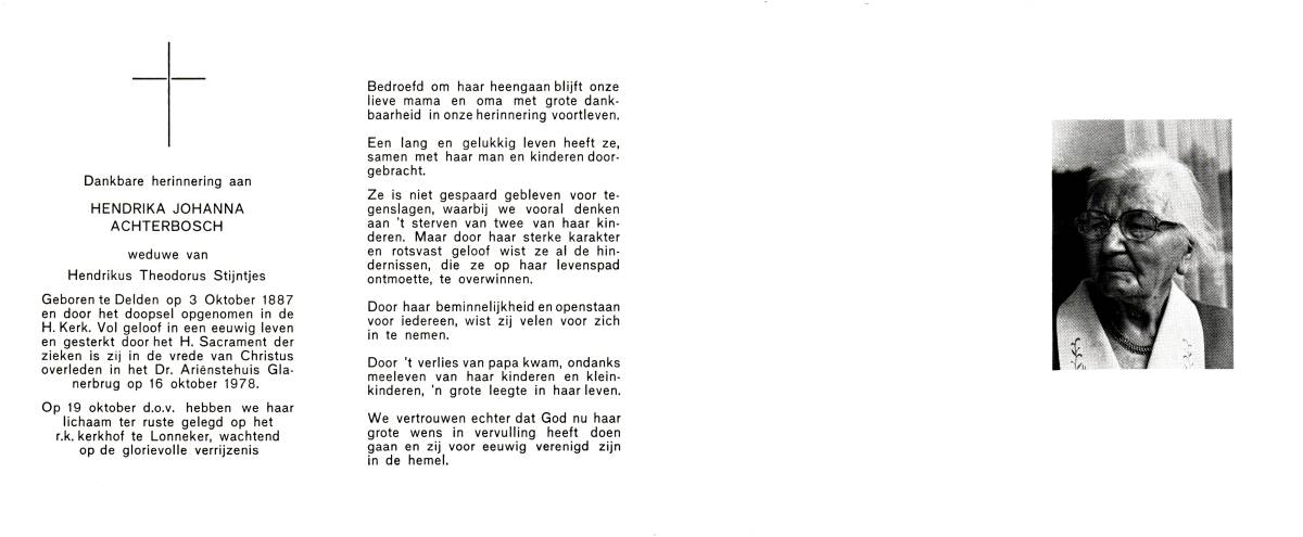 ACHTERBOSCH, Hendrika Johanna, geboren op 03-10-1887 te Delden, overleden op 16-10-1978 te Glanerbrug op 91-jarige leeftijd, begraven op 19-10-1978 te Lonneker.
