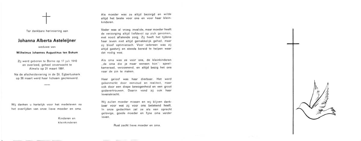 ASTELEIJNER, Johanna Alberta, geboren op 17-7-1910 te Borne, overleden op 21-3-1991 te Almelo op 80-jarige leeftijd, gecremeerd op 26-3-1991 te Almelo.