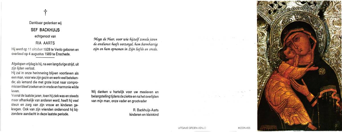 BEEK, van, Jan, geboren op 11-8-1912 te Lonneker, overleden op 19-4-1990 te Enschede, ziekenhuis op 77-jarige leeftijd, gecremeerd op 24-4-1990 te Usselo.