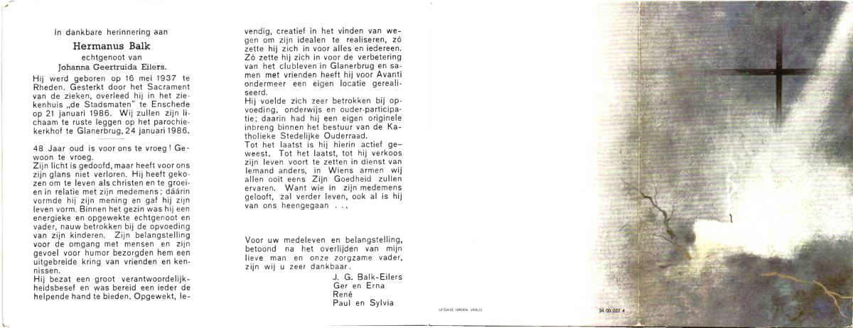 BALK, Hermanus, geboren op 16-5-1937 te Rheden, overleden op 21-1-1986 te Enschede, ziekenhuis op 48-jarige leeftijd, begraven op 24-1-1986 te Glanerbrug.