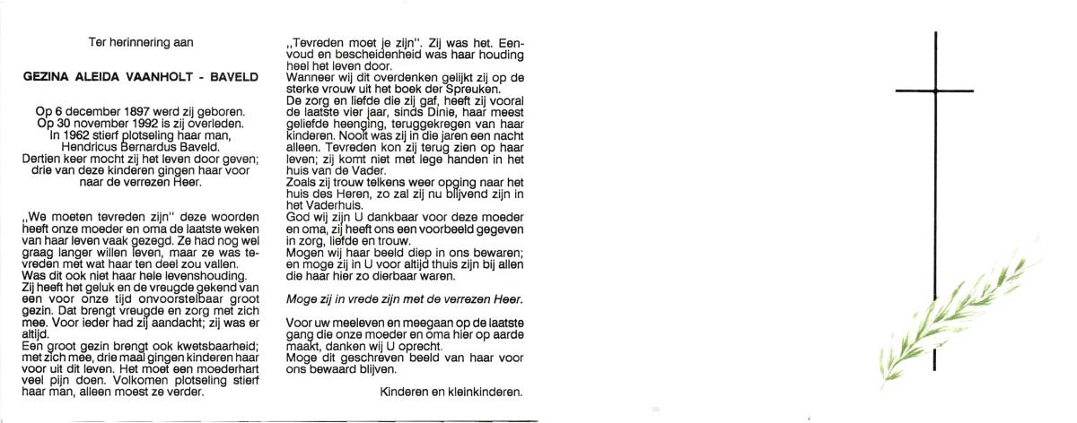 BAVELD, Gezina Aleida, geboren op 06-12-1897, overleden op 30-11-1992 op 94-jarige leeftijd.