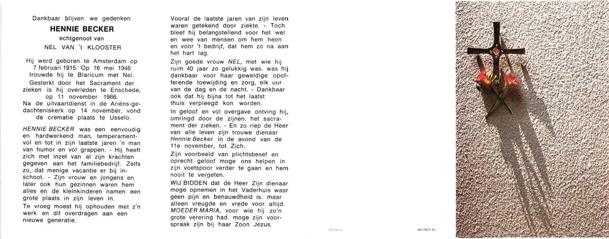 BECKER, Hennie, geboren op 7-2-1915 te Amsterdam, overleden op 11-11-1986 te Enschede op 71-jarige leeftijd, gecremeerd op 14-11-1986 te Usselo (Gem. Enschede).