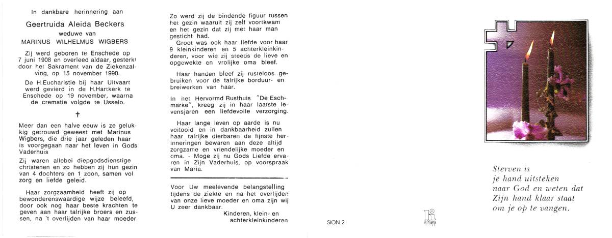 BECKERS, Geertruida Aleida, geboren op 7-6-1908 te Enschede, overleden op 15-11-1990 te Enschede op 81-jarige leeftijd, gecremeerd op 19-11-1990 te Usselo (Gem. Enschede).