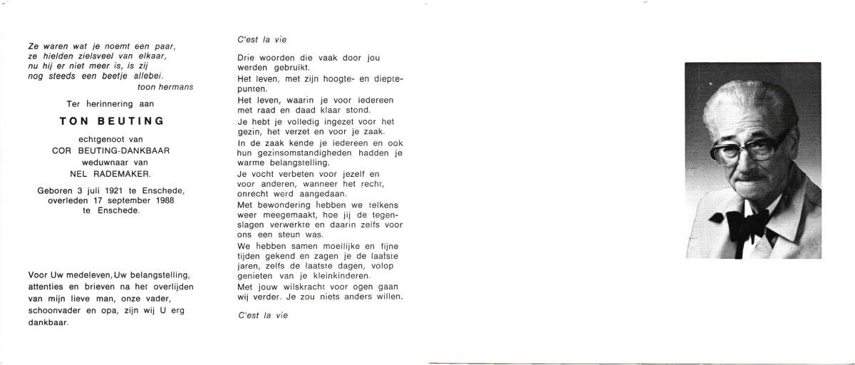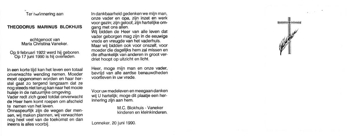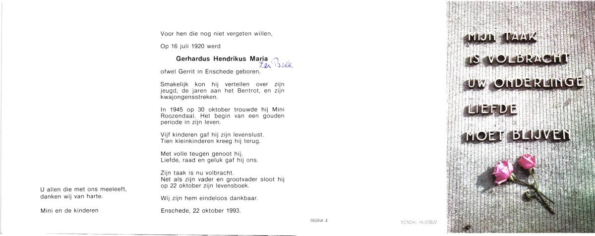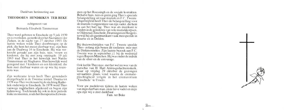 BEKE, ter, Theodorus Hendrikus, geboren op 5-7-1930 te Enschede, overleden op 27-10-1993 te Enschede op 63-jarige leeftijd, gecremeerd op 29-10-1993 te Usselo (Gem. Enschede).