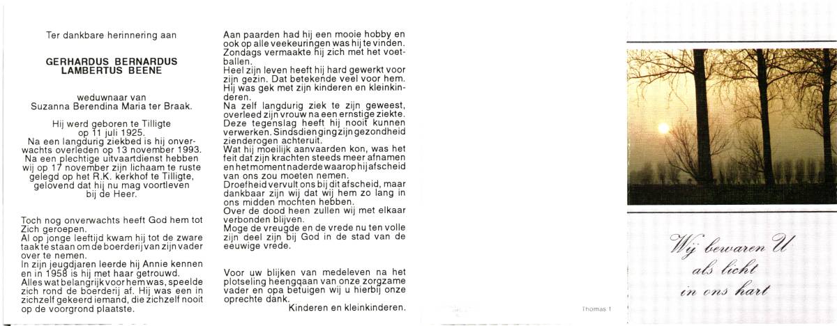 BEENE, Gerhardus Bernardus Lambertus, geboren op 11-7-1925 te Tilligte, overleden op 13-11-1993 te Tilligte op 68-jarige leeftijd, begraven op 17-11-1993 te Tilligte.