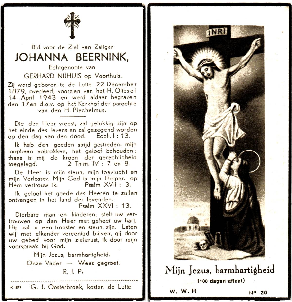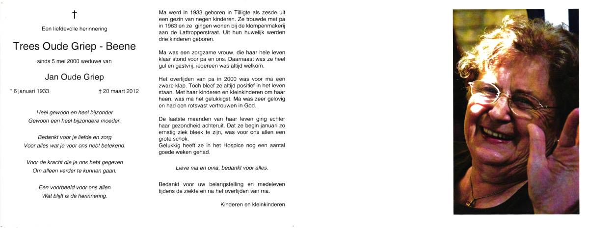 BEERNINK, Johanna Gezina, geboren op 3-3-1920 te Geesteren, overleden op 12-3-1980 te Oldenzaal, ziekenhuis op 60-jarige leeftijd, begraven op 15-3-1980 te Tilligte.