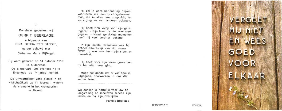 BEERLAGE, Gerrit, geboren op 14-10-1916 te Oldenzaal, overleden op 6-2-1991 te Enschede op 74-jarige leeftijd, gecremeerd op 11-2-1991 te Usselo (Gem. Enschede).