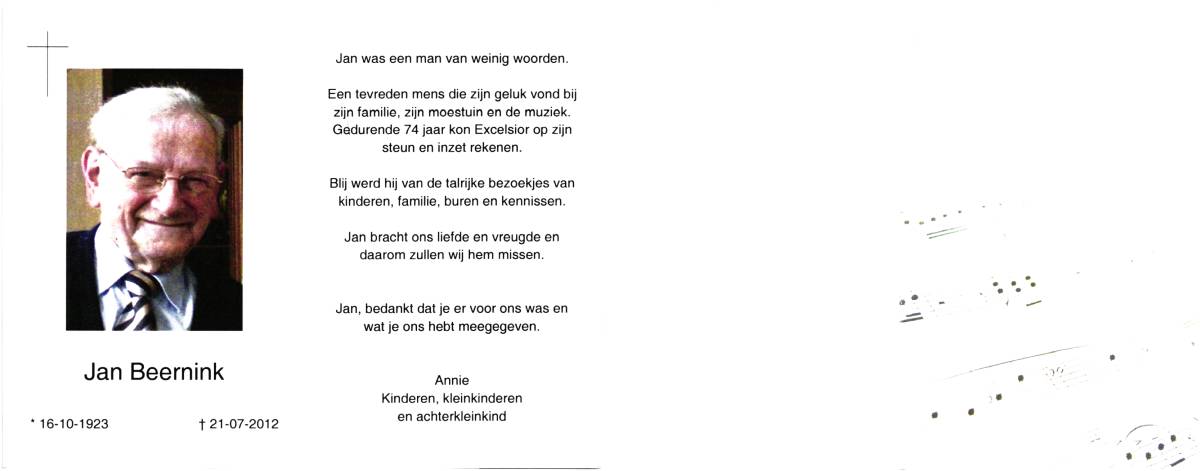 BEERNINK, Jan, geboren op 16-10-1923, overleden op 21-7-2012 op 88-jarige leeftijd.