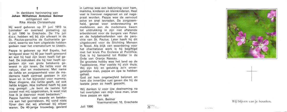 BEIMER, Johan Wilhelmus Antonius, geboren op 27-6-1913 te Lonneker, overleden op 6-7-1990 te Enschede op 77-jarige leeftijd, gecremeerd op 11-7-1990 te Usselo (Gem. Enschede).
