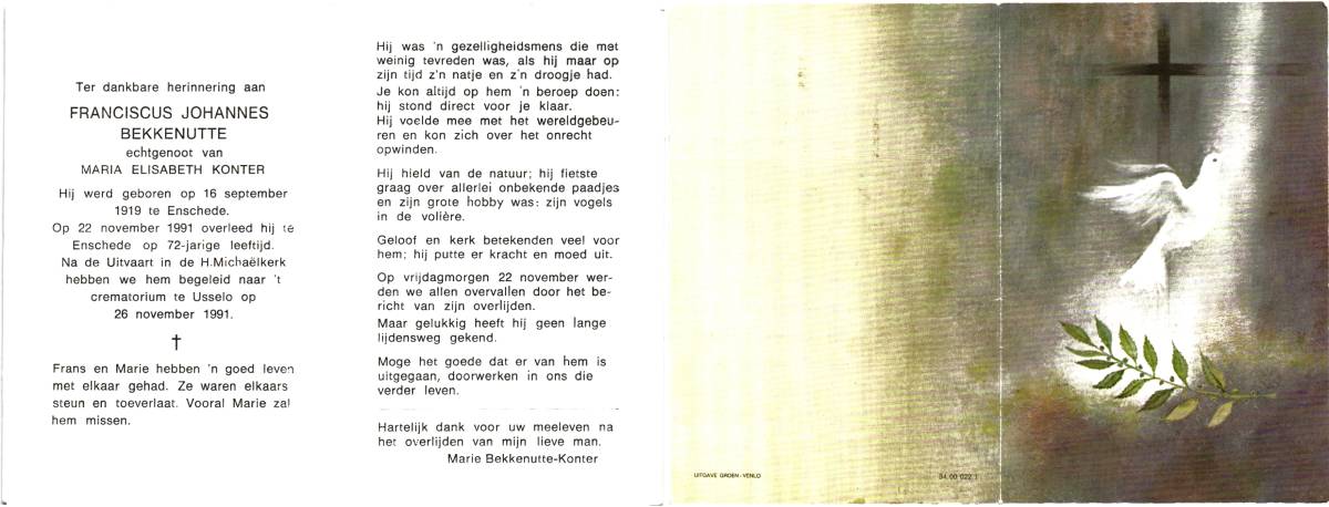 BEKKENUTTE, Franciscus Johannes, geboren op 16-9-1919 te Enschede, overleden op 22-11-1991 te Enschede op 72-jarige leeftijd, gecremeerd op 26-11-1991 te Usselo (Gem. Enschede).