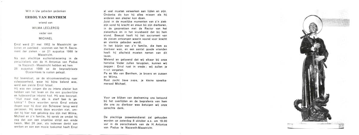 BENTHEM, van, Errol, geboren op 21-6-1962 te Maastricht, overleden op 21-8-1988 te Maastricht op 26-jarige leeftijd, begraven op 25-8-1988 te Oostermaas.