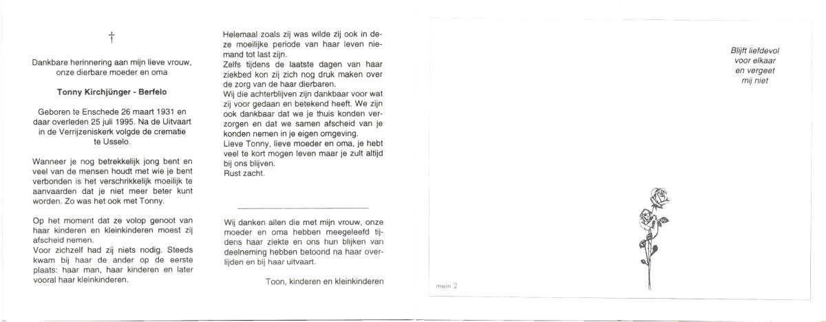 BERFELO, Tonny, geboren op 26-3-1931 te Enschede, overleden op 25-7-1995 te Enschede op 64-jarige leeftijd, gecremeerd te Usselo (Gem. Enschede).