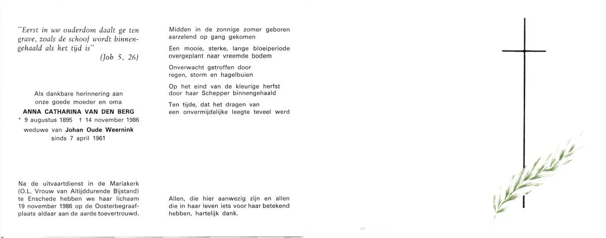 BERG, van den, Anna Catharina, geboren op 09-08-1895, overleden op 14-11-1986 te Enschede op 91-jarige leeftijd, begraven op 19-11-1986 te Enschede.