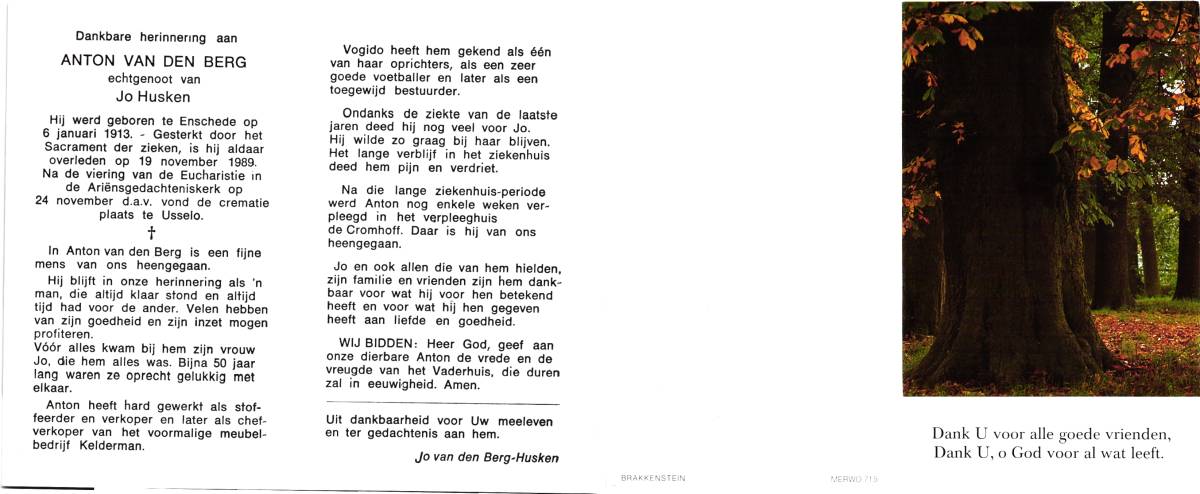 BERG, van den, Anton, geboren op 6-1-1913 te Enschede, overleden op 19-11-1989 te Enschede op 76-jarige leeftijd, gecremeerd op 24-11-1989 te Usselo (Gem. Enschede).