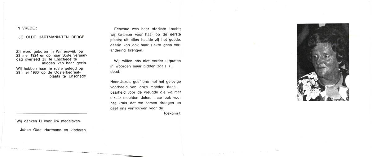 BERGE, ten, Jo, geboren op 23-5-1924 te Winterswijk, overleden op 23-5-1980 te Enschede op 56-jarige leeftijd, begraven op 29-5-1980 te Enschede.