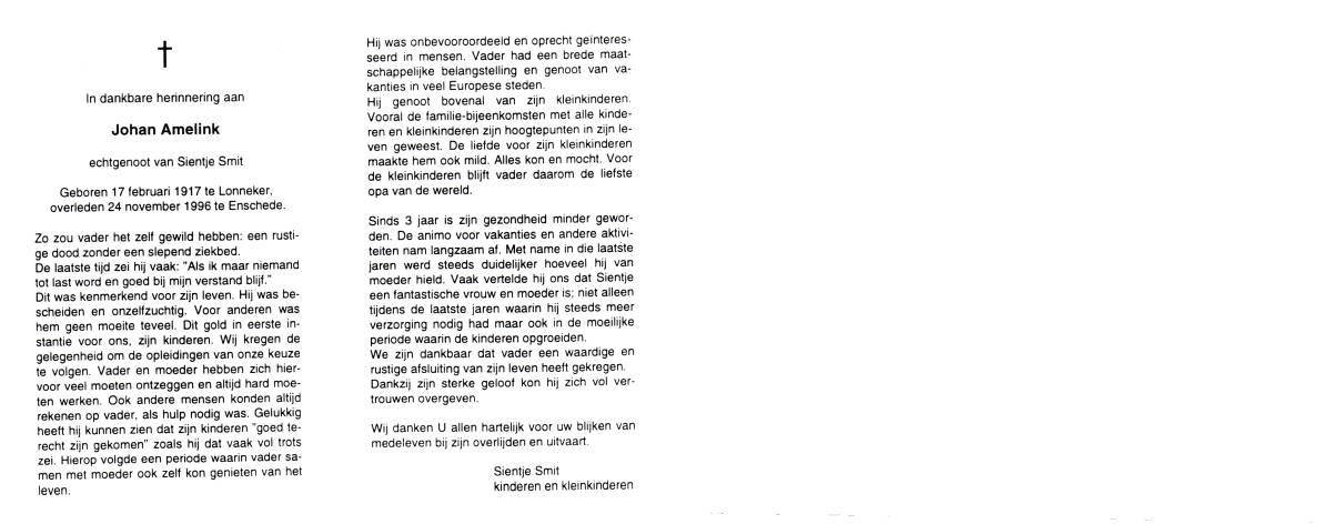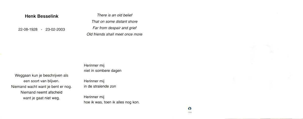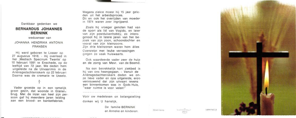 BERNINK, Bernardus Johannes, geboren op 27-8-1918 te Losser, overleden op 18-2-1991 te Enschede op 72-jarige leeftijd, gecremeerd op 22-2-1991 te Usselo (Gem. Enschede).