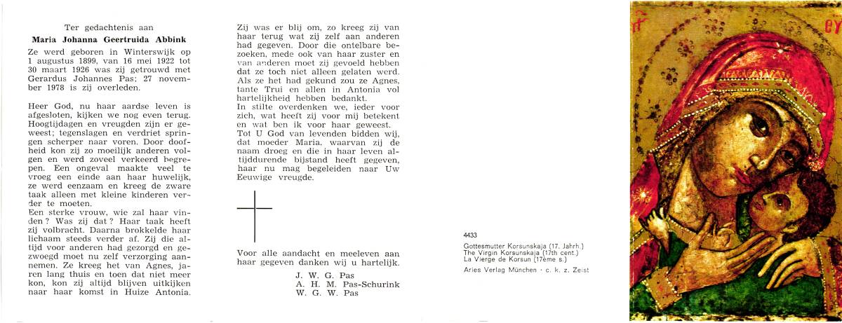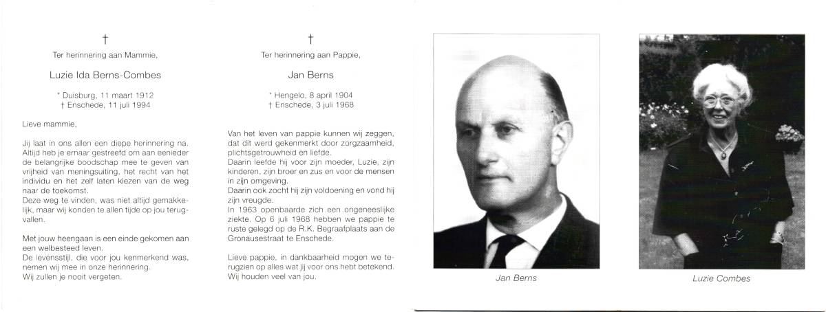 AL, Berendina Maria Hendrica, geboren op 29-3-1900 te Alkmaar, overleden op 11-3-1988 te Enschede op 87-jarige leeftijd, gecremeerd op 15-3-1988 te Usselo.
