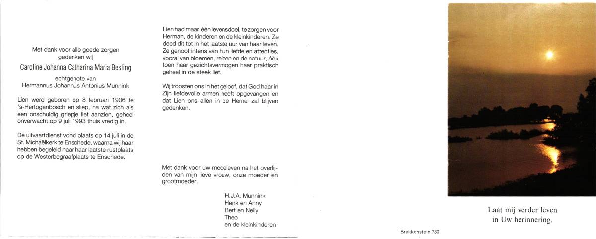 BESLING, Caroline Johanna Catharina Maria, geboren op 8-2-1906 te Den Bosch, overleden op 9-7-1993 te Enschede op 87-jarige leeftijd, begraven op 14-7-1993 te Enschede.