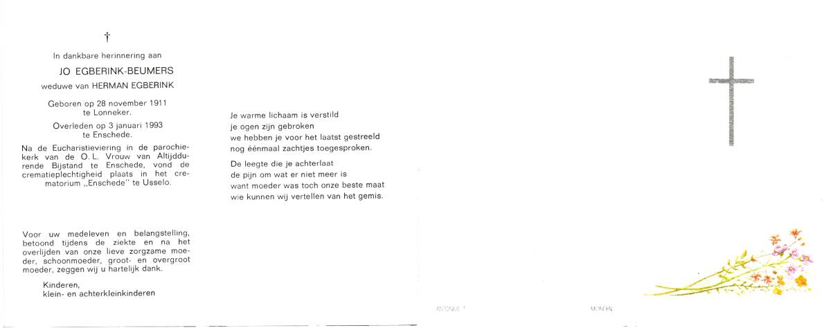 BEUMERS, Jo, geboren op 28-11-1911 te Lonneker, overleden op 3-1-1993 te Enschede op 81-jarige leeftijd, gecremeerd te Usselo (Gem. Enschede).