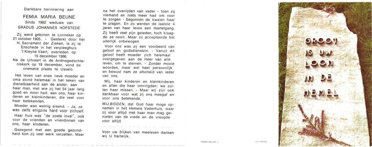 BEUNE, Femia, geboren op 21-10-1905 te Lonneker, overleden op 15-12-1986 te Enschede op 81-jarige leeftijd, gecremeerd op 19-12-1986 te Usselo (Gem. Enschede).