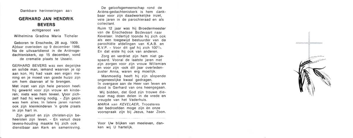 BEVERS, Gerhard Jan Hendrik, geboren op 28-8-1909 te Enschede, overleden op 9-12-1986 te Enschede op 77-jarige leeftijd, gecremeerd op 15-12-1986 te Usselo (Gem. Enschede).