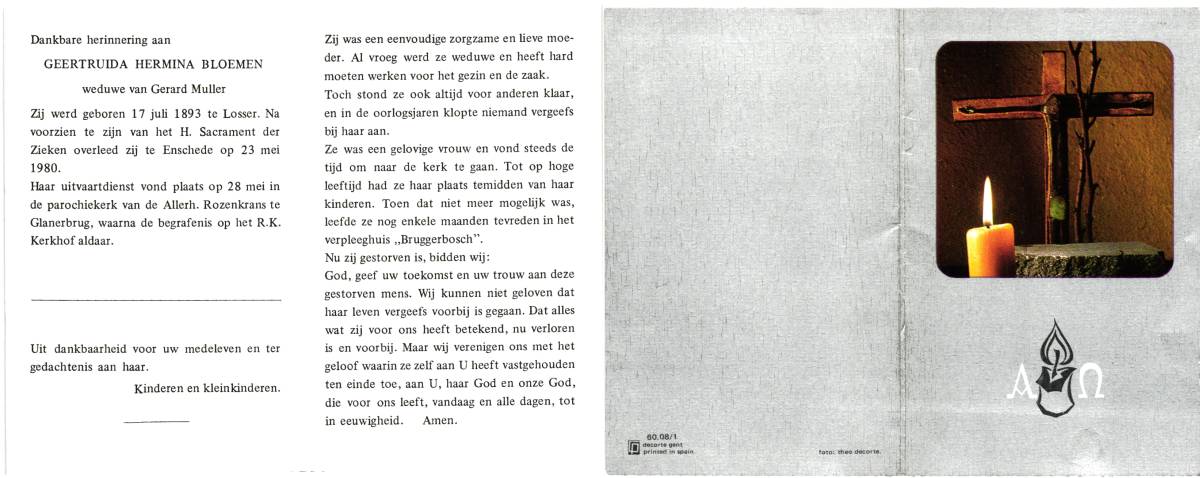 BLOEMEN, Geertruida Hermina, geboren op 17-07-1893 te Losser, overleden op 23-5-1980 te Enschede, ziekenhuis op 86-jarige leeftijd, begraven op 28-5-1980 te Glanerbrug.