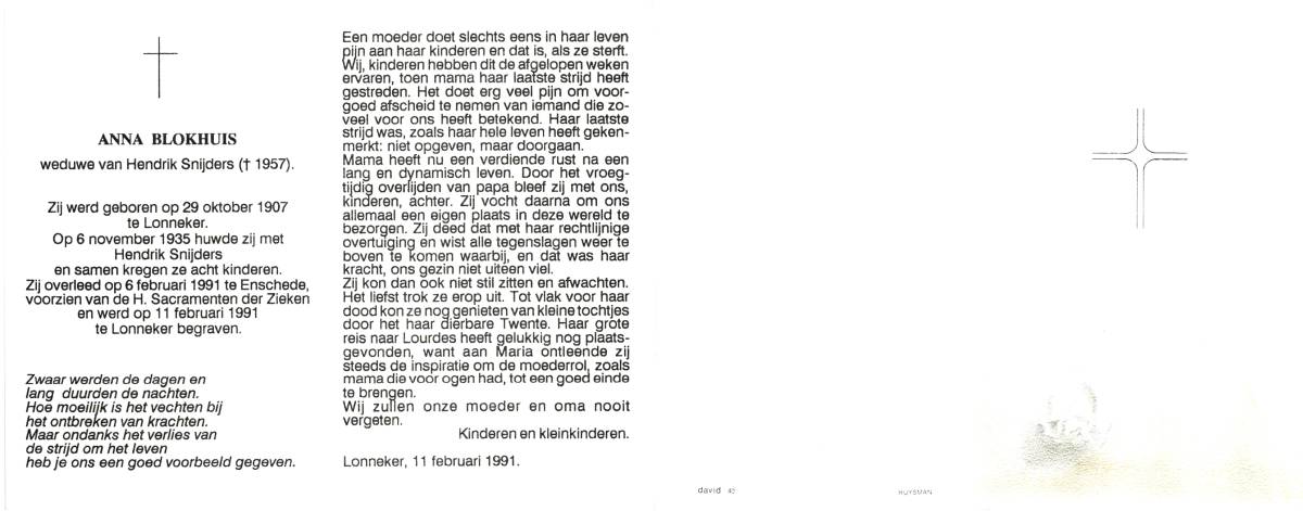 BLOKHUIS, Anna, geboren op 29-10-1907 te Lonneker, overleden op 6-2-1991 te Enschede op 83-jarige leeftijd, begraven op 11-2-1991 te Lonneker.
