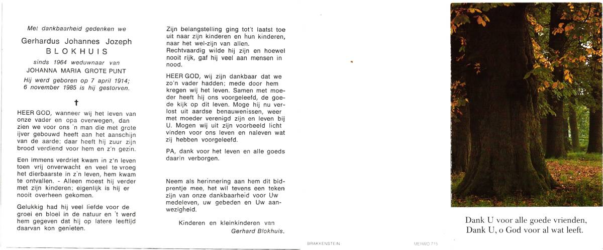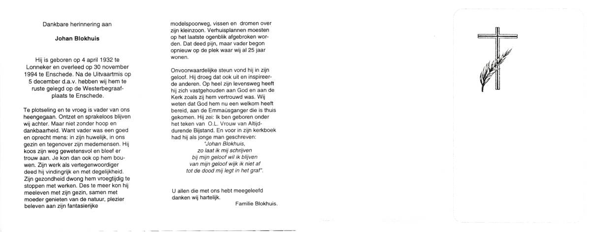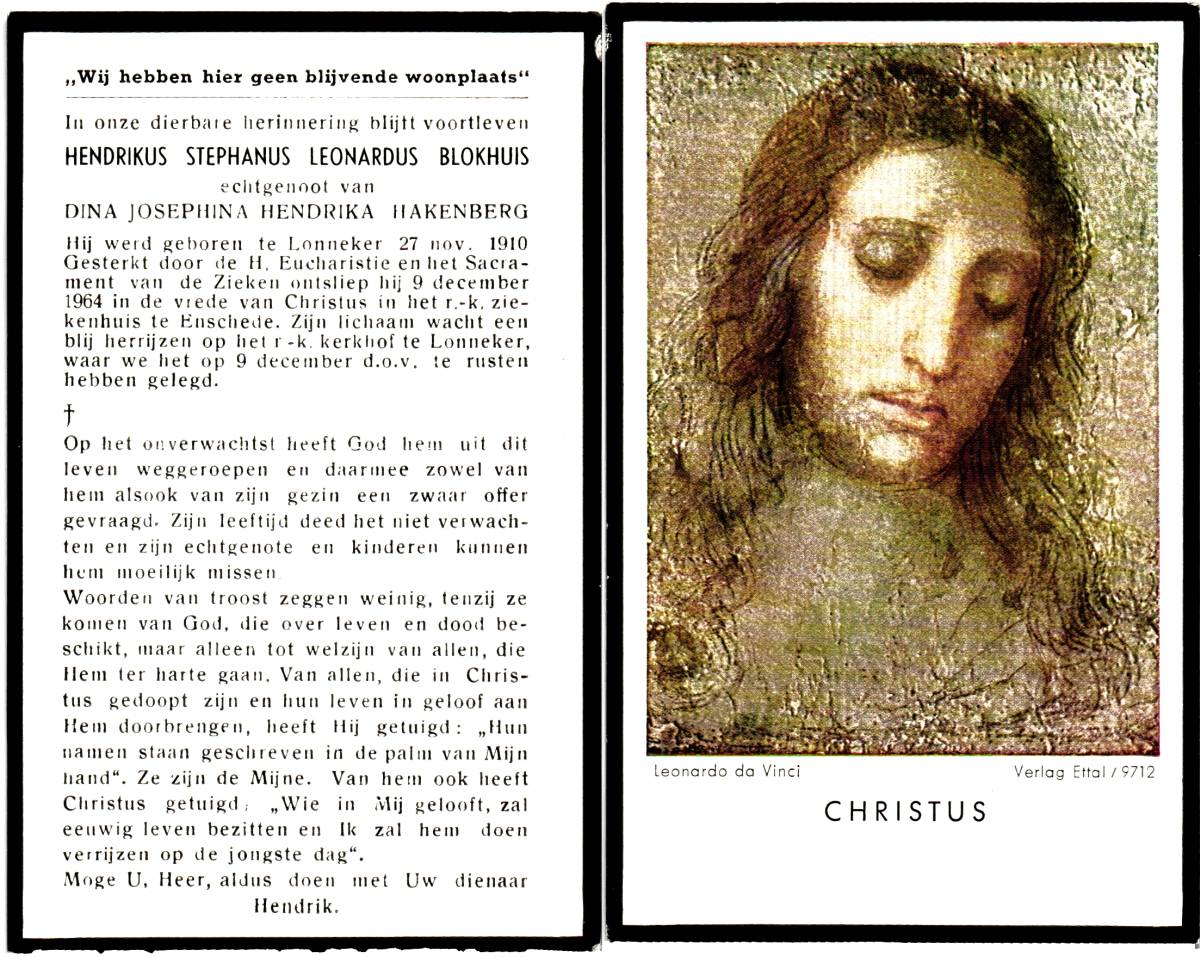 BLOKHUIS, Hendrikus Stephanus Leonardus, geboren op 27-11-1910 te Lonneker, overleden op 9-12-1964 te Enschede, ziekenhuis op 54-jarige leeftijd, begraven op 9-12-1964 te Lonneker.